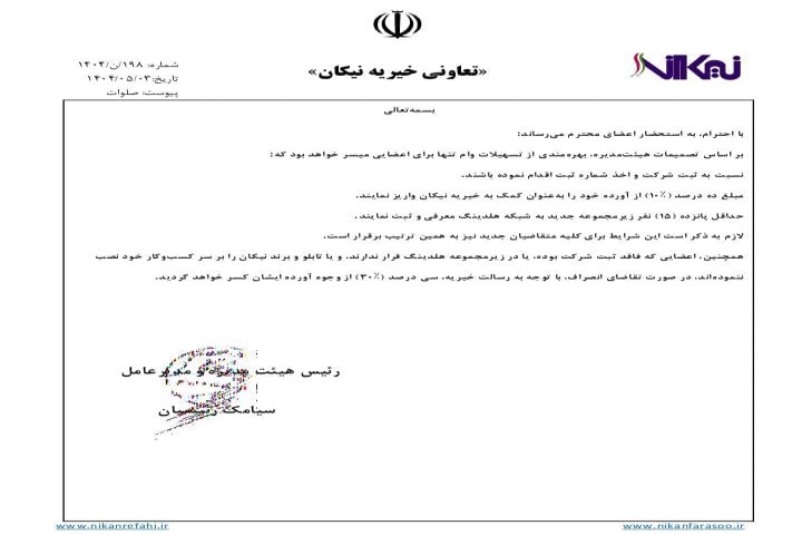 اطلاعیه تعاونی خیریه نیکان